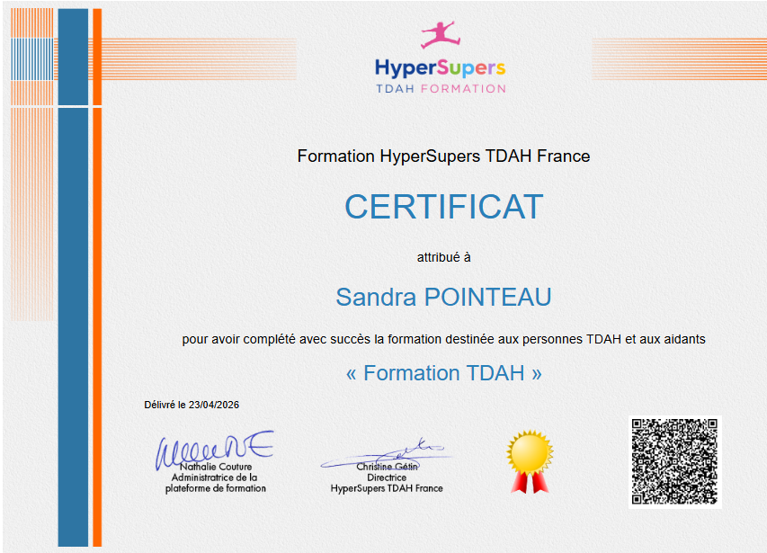 Je suis heureuse de vous annoncer que je viens d’obtenir mon certificat de fin de formation sur le TDAH (Trouble du Déficit de l’Attention avec ou sans Hyperactivité).